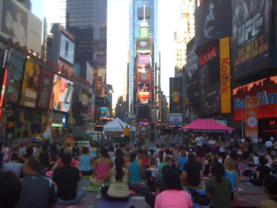 The little guy in the yellow shirt is instructor Douglass Stewart who co-founded the Solstice in Times Square event. He teaches at Yoga Works here in NYC, and was an amazingly motivational teacher. The class was inspiring-feeling the energy of the other students of all levels working together to create this amazing sense of peace and calm in the busiest place in New York City was a once in a lifetime feeling. I was so happy to be there!